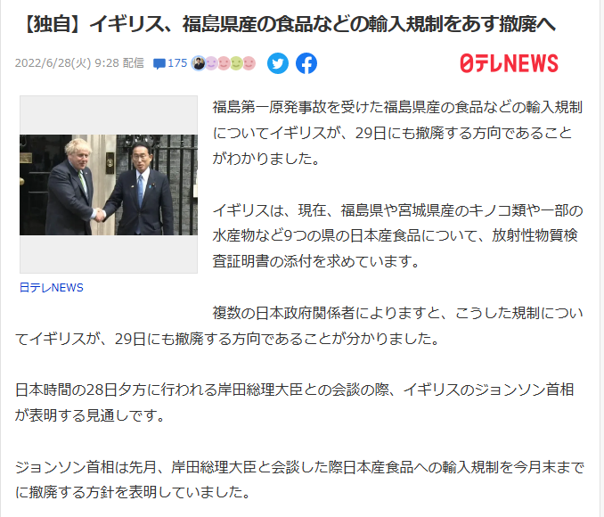 イギリス、福島県産の食品などの輸入規制を撤廃