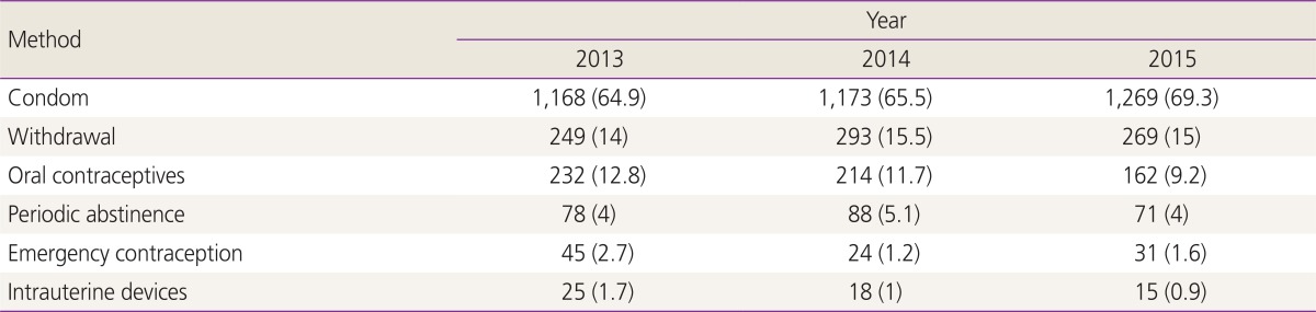 The mean age at first sexual activity was between 12.8 and 13.2 years old, and was similar during all three years. Among sexually active girls, 0.2% reported having experienced pregnancy, and 66.1% to 73.6% of them underwent induced abortion (data not shown).