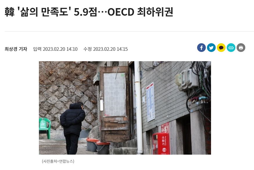 韓国人が主観的に評価する「暮らしの満足度」が経済協力開発機構(OECD)加盟国のうち最下位圏であることが分かった。>>176