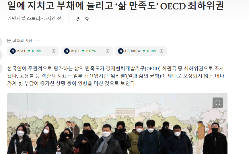 韓国人の「暮らしの満足度」が経済協力開発機構(OECD)加盟国の中で最下位圏であることが分かった。