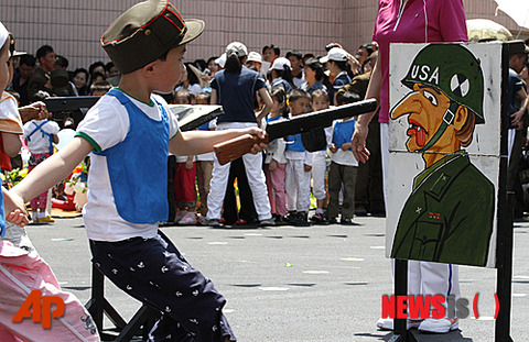 朝鮮以外の国々では、このような子供にあからさまに憎悪を教え込むのは不道徳の極みなので、親や周りの人々はかなり批判されると思うよ。