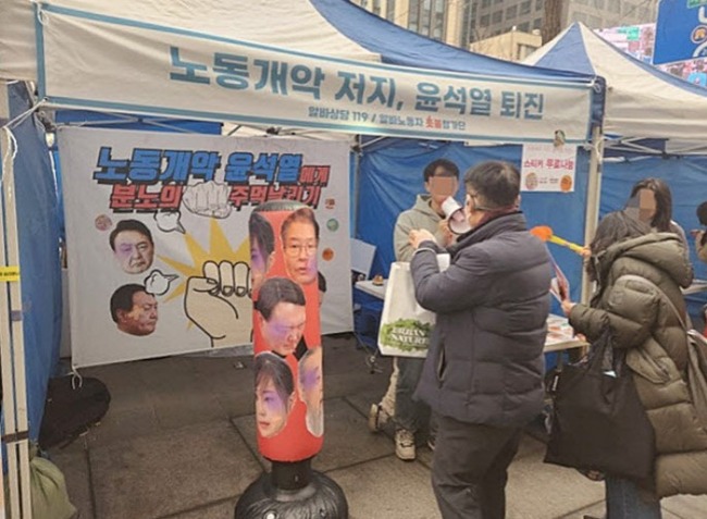 また「労働改悪尹錫悦に怒りの拳飛ばし」というブースを開き、ユン大統領夫妻と顔にあざができた顔写真が貼られたサンドバッグを設置し、参加を希望する市民にサンドバッグを叩けるようにした。