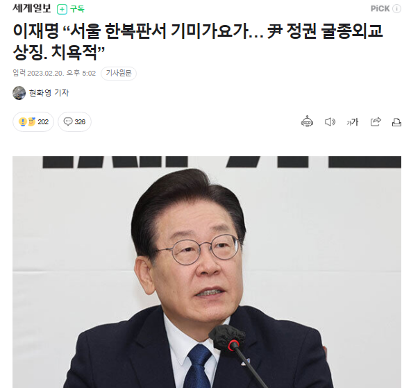 李代表は20日に開催された同党の最高委員会で「ソウル市内中心部で日王の誕生日パーティーが開かれ、日本の軍国主義を象徴する君が代が史上初めて演奏されたそうだ」「尹錫悦(ユン・ソンニョル)政権の対日低姿勢・屈従外交を象徴する恥辱的な光景だ。今は1945年の解放前の日帝時代のようだ」と述べた。
