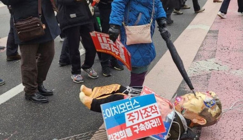 群衆が見てる中で、子供がユン大統領人形の目に傘の先を突き刺すとか。