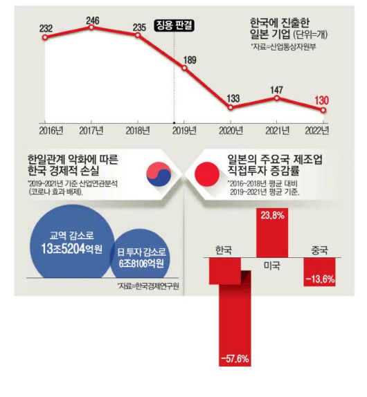 産業通商資源部によると、2018年基準で韓国に進出した日本企業は235社だった。 韓日関係が本格的に悪化し始めた2019年に189個に減り、コロナ19まで襲った2020年には133個に減少した。 昨年には130個で4年ぶりに半分近く急減した。 韓国に進出した新規法人は減り、撤退した企業は増えたのだ。 特に2019年を基点に、2021年まで3年平均156社の韓国国内の日本企業数は、前の3年(2016~2018年)と比較すると82件減った。 同期間、中国企業は30社減り、欧州連合(EU)企業は11社減少したのと比較しても、日本企業の「エクソダス」は目立った。