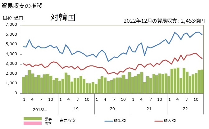 12月の日韓貿易収支は、韓国2453億円赤字、となっていますね。