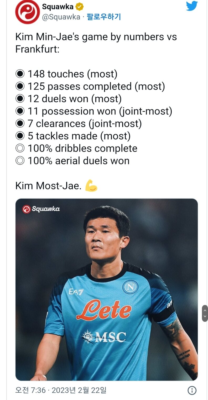 김민재 풀타임 양팀 최고 평점 달성+ 스탯 요약