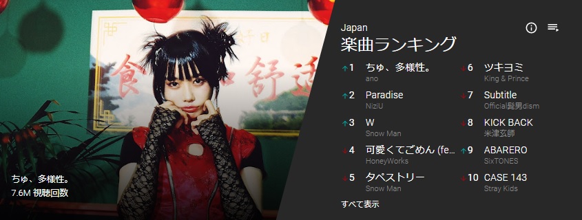 あのちゃんの「ちゅ、多様性。」今週の youtube MVランキングで1位。