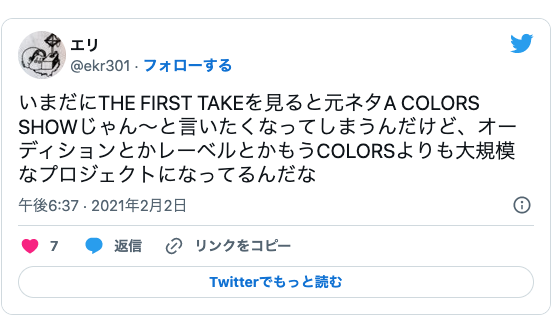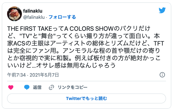 ファーストテイクの元ネタとなったとされるのは、ベルリンで立ち上げられたYouTubeチャンネル・COLORSだと言われています。まぁ韓国人が必死なのも分かる気がする、何故なら韓国にはK-pop とトロットしか食っていける音楽ジャンルが無いから、しかもどちらも日本のJ-pop と演歌のパクりだからね。それに韓国国民は音楽等の文化に金を使わないから他国に頼るし食っていけない。