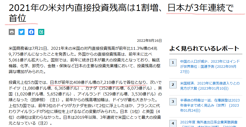 2021年の米対内直接投資残高は1割増、日本が3年連続で首位