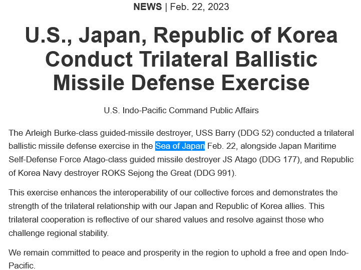 米国インド・太平洋司令部は22日にホームページで韓米日合同訓練のニュースを伝えながら、訓練海域を「東海」ではなく「日本海」と明らかにしました。