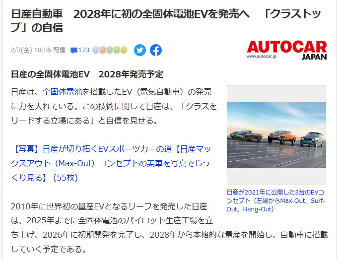 2023年2月20日、中国のポータルサイト・捜狐に、日本企業が全固体電池の開発に成功したことに対し、中国の自動車メーカーは危機感を持つ必要があるとする文章が掲載された。