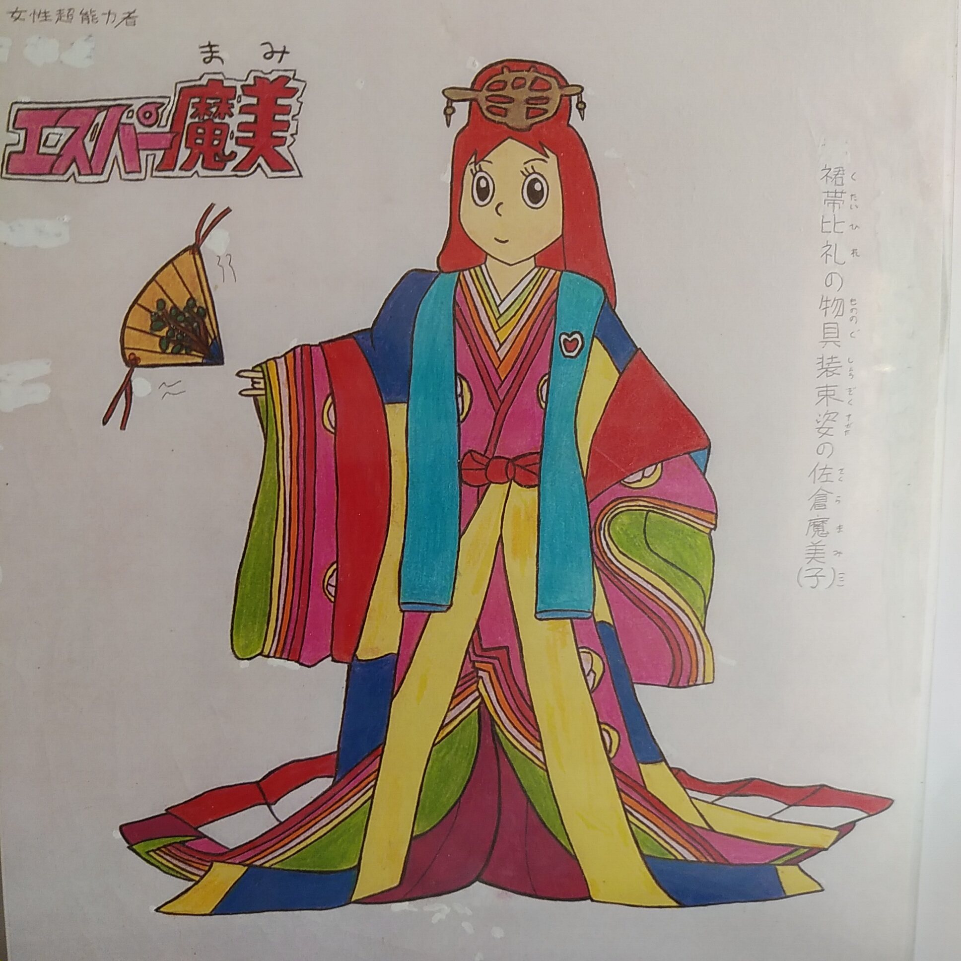 エスパー魔美は、14歳のごく普通(実は、公家華族)の女子中学生、佐倉魔美子、が、ある日、超能力に目覚める。彼女が超能力者ということは、親友の高畑和夫だけが知っている。魔美は高畑の助言のもと、超能力を使かって、困った人を助けます。困った人がいたら、非常ベルがなり、魔美は高畑助けにいきます、魔美は困った人を見捨てることが出来ない、自分を犠牲にしてまでも人助けする、とっても優しい女性です。彼女の父、十郎は、高校の美術教諭で、彼女をモデルとして、画家でもあります。彼女の母、菜穂子は、大手新聞社の外信部記者で、かなりの才女、令嬢です。佐倉家は、普通のようだか、実は、戦前まで、公家華族で、先祖は、公家です。彼女の曾祖父は、フランスに留学して((明治に留学できるのは、かなりの家柄、絵を家業としていたから、公家華族)フランス人の女と結婚します。魔美が髪の毛が赤いのは、フランス人の血が入っているからです。エスパー魔美は、1987年から1989年にかけて、アニメで放送してます。