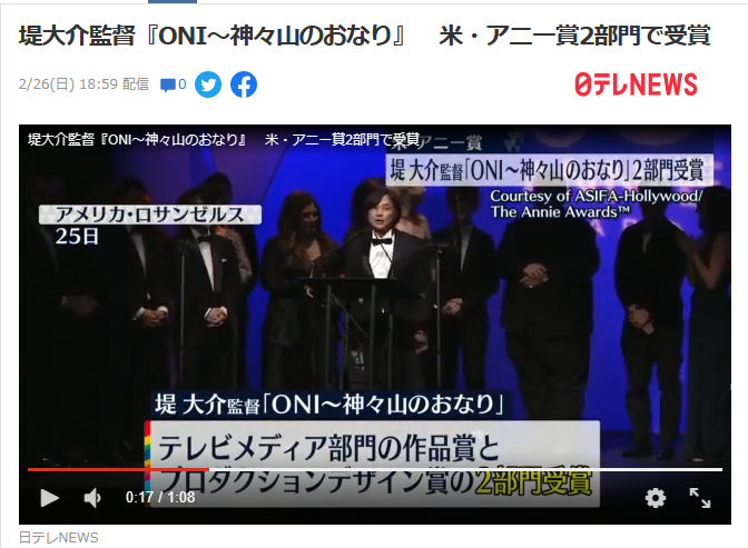 アニメのアカデミー賞と呼ばれるアニー賞で堤大介監督の『ONI~神々山のおなり』がテレビメディア部門の作品賞など2部門で受賞しました。