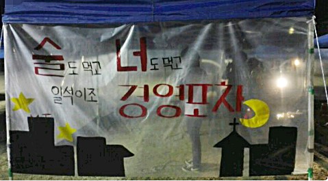 問題が大きくなったのは、あるユーザーが同大学のFacebookに、卒業式会場で掲げられた“垂れ幕”をアップしたからだ。垂れ幕には赤字で大きく「オッパ(お兄ちゃん)! 祝・卒業」と書かれているのだが、実はその下にも黒字で小さく文字が書かれている。