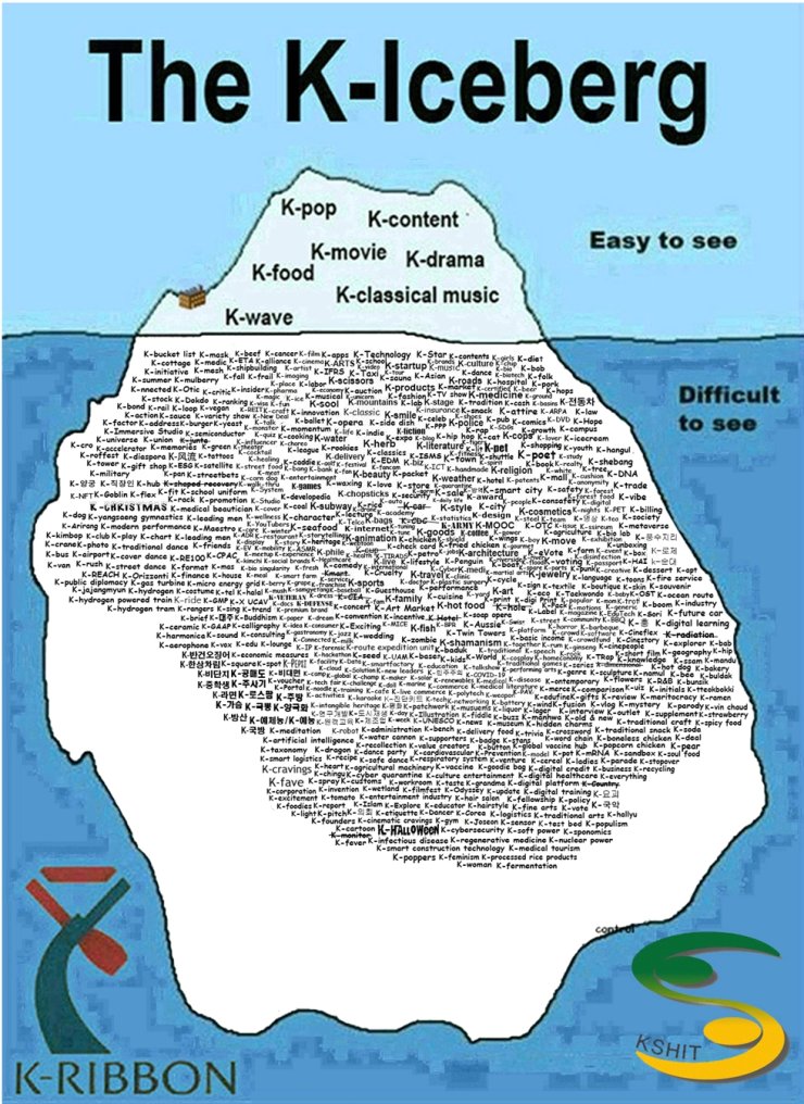 数年前、私はこれらのK-entryを集め始めた。ネットで「文化の氷山」の画像を見て、それをテンプレートにして「K-Iceberg」を作りました。文化は実に複雑な概念であり、文化の氷山は、文化が私たちが考えるよりもはるかに多面的であることを示していますが、韓国版は、あるシンプルなブランディング戦略が、韓国の多くの産業で普及していることを示しています。元々、私は自分が何に巻き込まれるのか、全く分かっていませんでした。