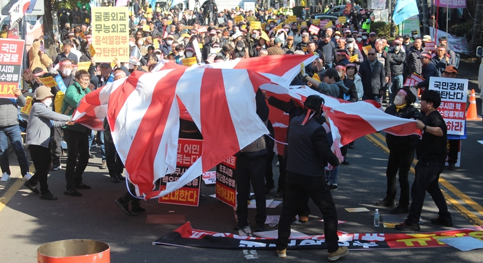 済州で引き裂かれた旭日旗… 「原発汚染水放流停止」