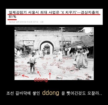 ソウルの「風光」のひとつは小川というか下水と言うか水路である。蓋のない広い水路を暗くよどんだ水が、かつては砂利だった川底に堆積した排泄物やごみの間を悪臭を漂わせながらゆっくりと流れていく。 水ならぬ混合物をひしゃくで手桶に組んだり、小川ならぬ水たまりで洗濯している貧困層の女性の姿に、男ばかりの群衆を見飽きた目にも或いは生気を取り戻すかもしれない>>115
