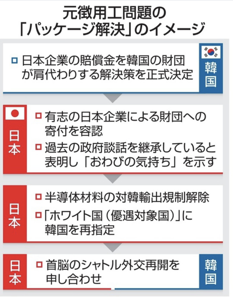 外務省間で検討しているのは、まず韓国政府が日本企業の賠償金支払いを韓国の財団が肩代わりする解決策を正式発表。日本政府は有志の日本企業による財団への寄付を容認し、過去の政府談話や日韓共同宣言の継承を表明して元徴用工らへの「おわびの気持ち」を示す段取りだ。