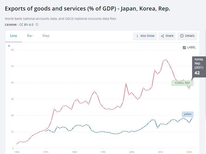 それに比べ、韓国の場合、輸出依存度かGDP比42%と高く、(資料2)