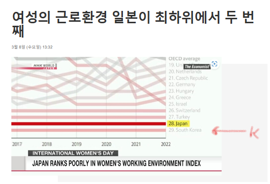 3月8日の「国際女性デー」を控え、英国の時事週刊誌エコノミストが6日(現地時間)に発表した「ガラスの天井指数(The glass-ceiling index)」で、韓国は調査対象29カ国のうち29位となった。