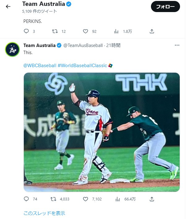 ガッツポーズで身を前に乗り出し、かかとが二塁ベースから浮いた。すかさず中継の遊撃手ウェードがタッチ。判定はセーフだった。ここでオーストラリアはチャレンジでリプレー検証を要求。タッチが認められ、姜白虎は一転、アウトになった。