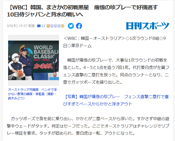 韓国が痛恨の珍プレーで、大事な1次ラウンドの初戦を落とした。4-5と1点を追う7回1死。代打姜白虎が左翼フェンス直撃の二塁打を放った。同点のランナーとなり、二塁でガッツポーズを繰り出した。