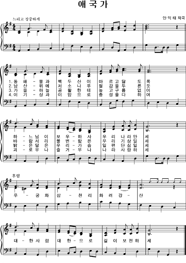 現在の愛国歌の歌詞は、1896年の獨立門定礎式の際、白頭山を歌った愛国詩にアメリカ人宣教師たちが賛美歌として伝えたスコットランド民謡 "Auld Lang Syne"(日本では「蛍の光」)のメロディーをつけて歌ったものとも、また三・一運動直後、上海で樹立された大韓民国臨時政府により採用されたものとも言われる。>>1