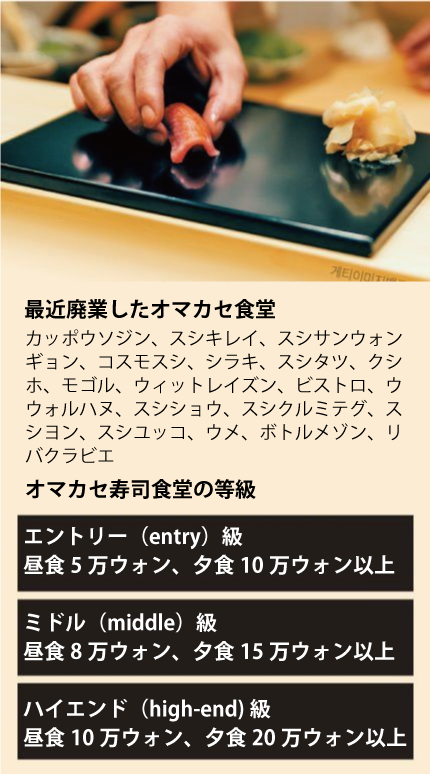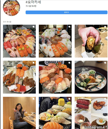 インスタグラムのハッシュタグにハングルで「おまかせ」と入力すれば、和風レストランの内装とともに寿司、鉄板焼きなど、和食の写真が続々と表示される。韓国の「おまかせ」は、高級和食レストランや、回転寿司ではない寿司のコース料理を意味していることが多い。韓国のレストラン予約アプリの中で最も多くのユーザー(ダウンロード100万回以上)を獲得している「キャッチテーブル」では、「おまかせ」メニューをクリックすると400以上の高級和風レストランが紹介される。レストラン選択のトップに「おまかせ」を設定していることからも人気のほどが分かるだろう。さらに「すしそら」「おさい寿司」など「おまかせ」専門チェーン店まででき、今後「おまかせ」が業界にさらに広がる兆しも見せている。