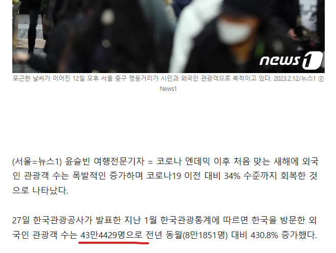 ●韓国観光公社が発表した1月の韓国観光統計によると、韓国を訪れた外国人観光客数は43万4429人>>1