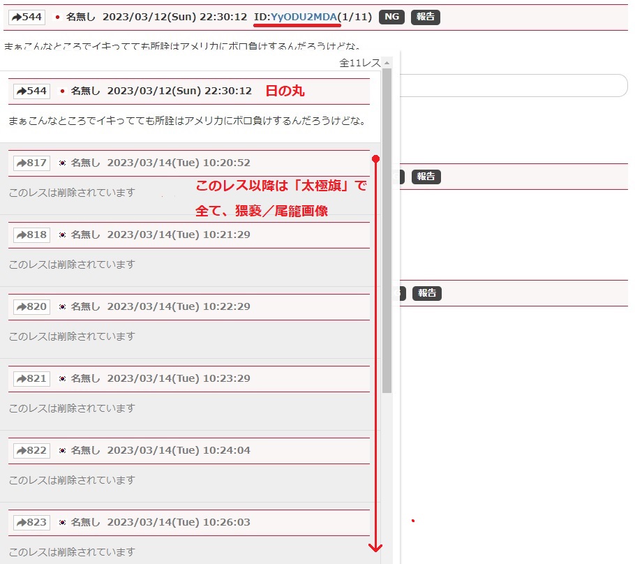 いつもどおり日の丸での投稿の後、「太極旗」で今回と同じく猥褻/尾籠画像を連続して貼っています。