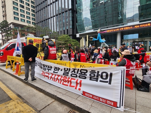 市民団体「日本軍性奴隷制問題解決のための正義記憶連帯(正義連)」は同日正午、少女像の向かい側で慰安婦問題の解決を求める定例の「水曜集会」を開き、韓国政府による韓日首脳会談の開催推進を非難した。