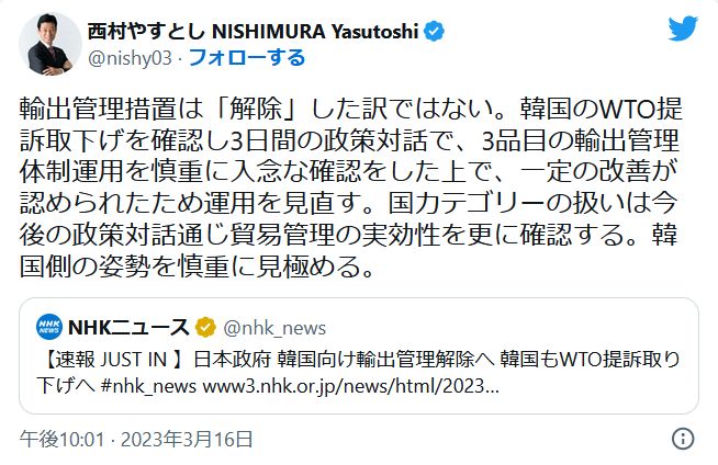 今回の会談で韓国側に輸出管理の改善が報告されたので現在の運用を見直すが、実効性を監視して韓国の姿勢を見極めるとなっている。>>41