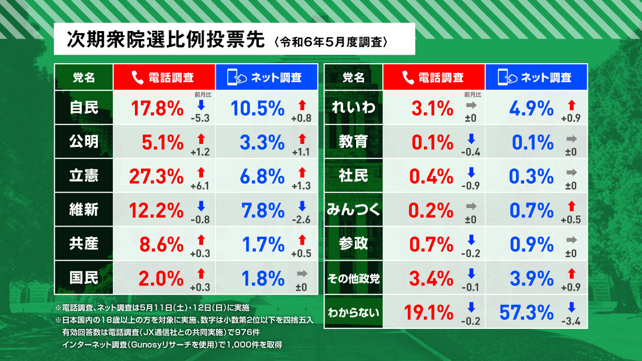 衆院選比例投票先で立憲民主党が自民党超え!内閣支持率は再び2割未満に!(電話調査)2024年5月選挙ドットコムリサーチ