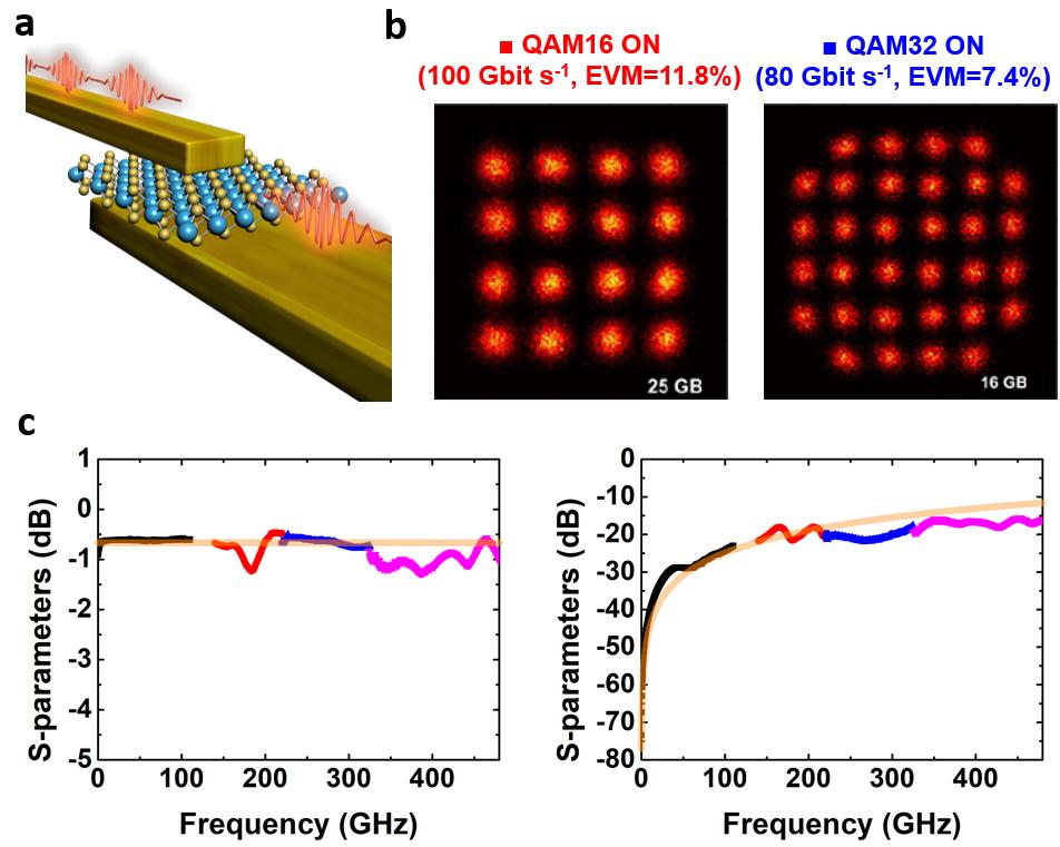 끊기지 않는 AR·VR을 구현하기 위한 복잡한 신호 변조 기술도 지원 가능하다. 신호 변조는 신호를 빠르게 전달하기 위해 전파를 적합한 주파수나 파형으로 바꾸는 과정을 말한다.>>57 실험에서 480 GHz(기가헤르츠)의 측정 범위까지 온(on)상태에서 작은 저항 값과 오프(off)상태에서 작은 커패시터 값을 보였으며, 이는 테라헤르츠 고주파 대역에서이 스위치가 작동한다는 의미다. 또 다양한 변조 기술에서 최대 100Gbit/s 의 전송 속도를 만족하는 동시에, 이를 낮은 오차율과 높은 신호 대 잡음비로 처리할 수 있었다.