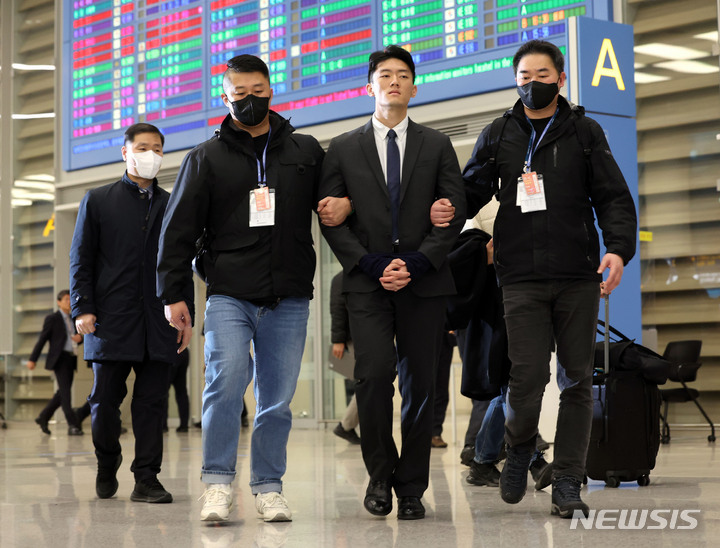 【NEWSIS】全斗煥(チョン・ドゥファン)元大統領の孫チョン・ウウォン容疑者が28日午前、仁川国際空港に到着・帰国後、警察に逮捕され、ソウル警察庁麻薬犯罪捜査隊に護送された。写真=共同取材団南朝鮮の内紛?