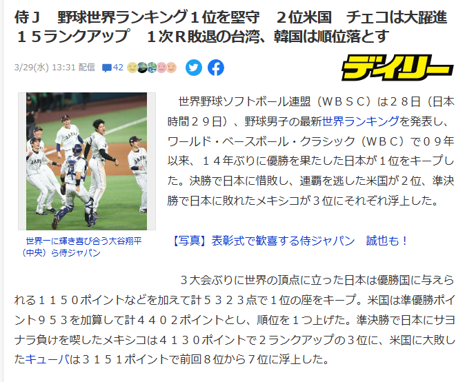 世界野球ソフトボール連盟(WBSC)は28日(日本時間29日)、野球男子の最新世界ランキングを発表し、ワールド・ベースボール・クラシック(WBC)で09年以来、14年ぶりに優勝を果たした日本が1位をキープした。決勝で日本に惜敗し、連覇を逃した米国が2位、準決勝で日本に敗れたメキシコが3位にそれぞれ浮上した。