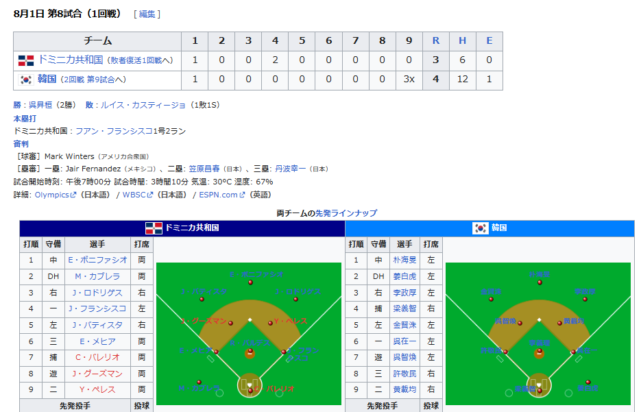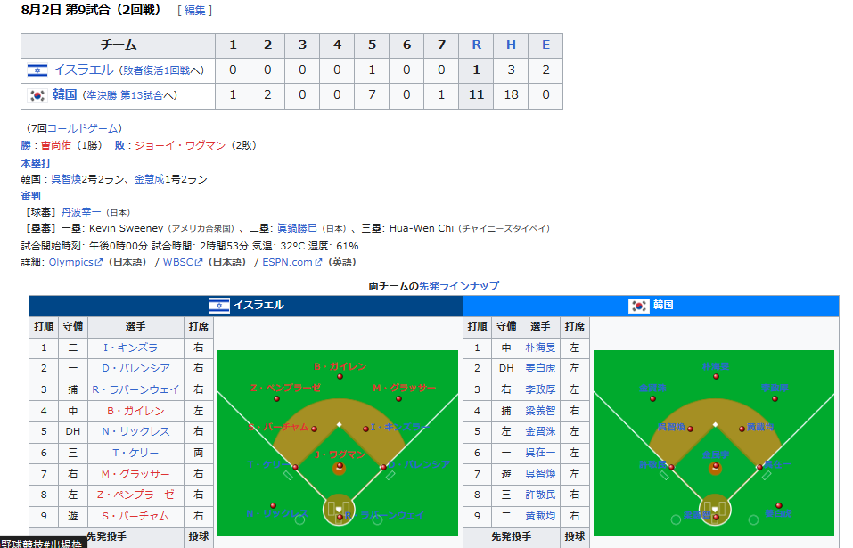 カン・ベクホのセレモニー離塁アウトは相当バズったし、落ち武者ロン毛ピッチャーも日本では結構話題だった。ある意味1次Rの話題の中心だったと思う