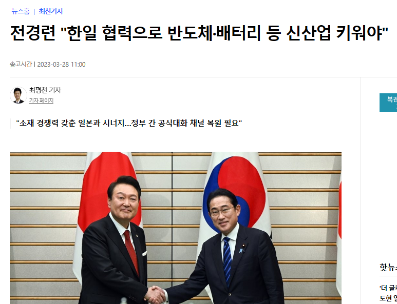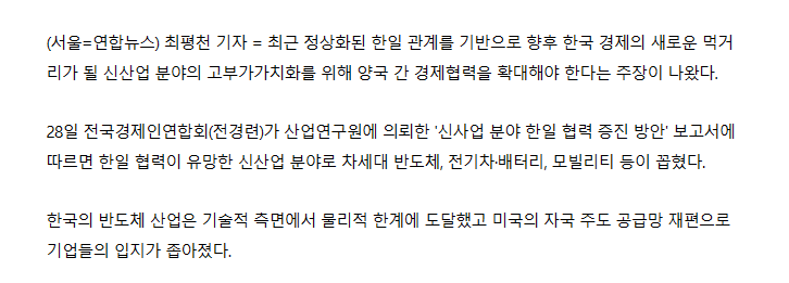 28日、全国経済人連合会(全経連)が産業研究院に依頼した「新事業分野における日韓協力促進方案」報告書によると、日韓協力が有望な新産業分野として次世代半導体、電気自動車・バッテリー、モビリティなどが挙げられた。