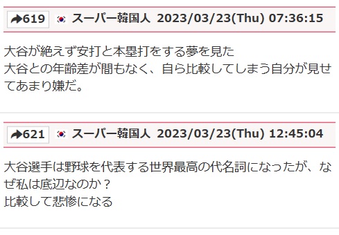 それな。バ韓国人はソンフンミンのほうが上だという。だけど本心ではソンなんかより大谷が羨ましくってしょうがねぇ。これも見栄を張りがたいための一種の嘘。>>19