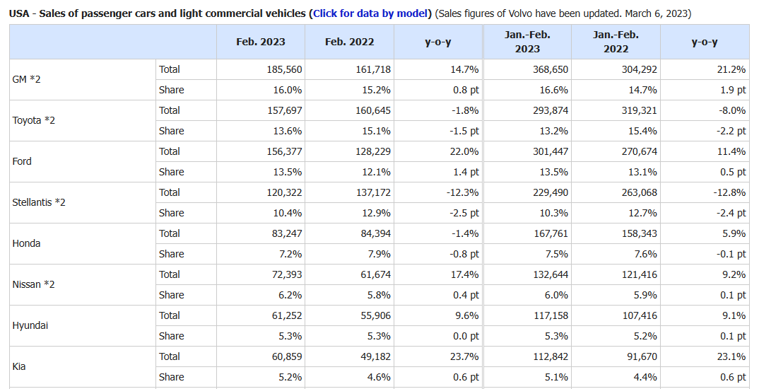 ・3月のランキングは、GM、トヨタ、フォード、ステランティスの順だが、第1四半期のランキングではトヨタとフォードの順位が逆転する。