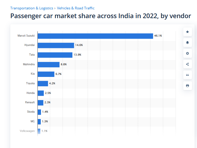 2022年のインドにおける乗用車市場シェアサムスンの創業者一族が「親日嫌韓」だと言われて、今度は現代自動車の話題に変えたかw