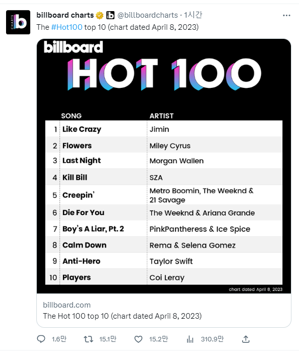 韓国ボーイズグループBTS(防弾少年団)JIMINのシングル『Like Crazy』がビルボード(Billboard)のメインチャート1位から45位に順位が急落した中で、米国フォーブスがこれについて「ビルボード史上最も大幅な順位下落」と報じた。