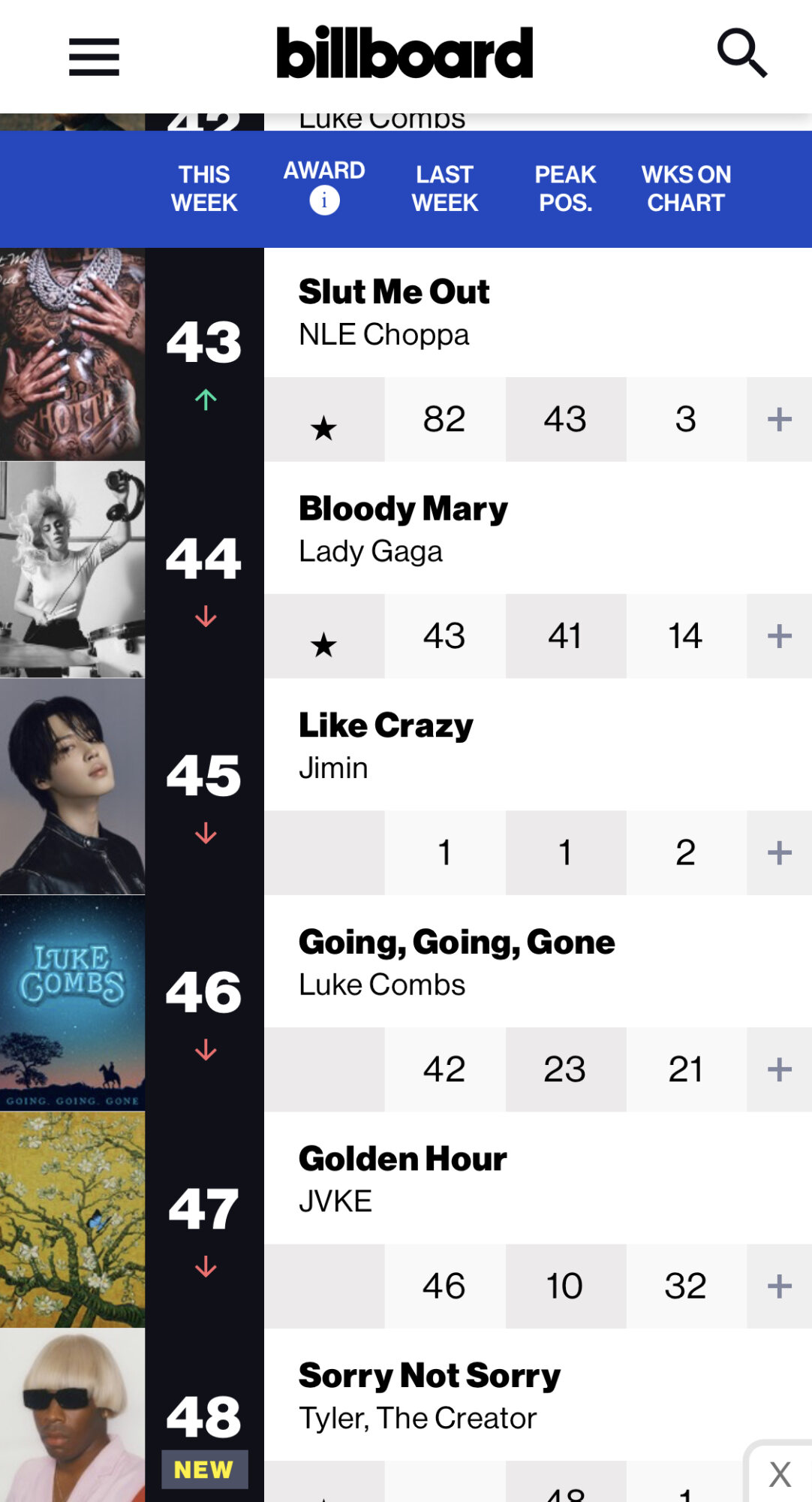 フォーブスはJIMINがこの1週間で「Hot 100」1位から45位に落ちたことについて「祝う価値があることではない」とし「該当チャートの半世紀の歴史の中で最も大きな順位下落」と報じた。