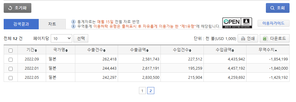 국가별로는 한국 제품의 판매 호조가 이어지고 있다. 2022년 총 수입 금액은 775억3000만엔으로 전년비 125% 수준이며, 점유율은 23.4%까지 올랐다. 프랑스가 한국에 이어 764억4000만엔으로 2위를 차지했다. 점유율은 23.0% 수준이다.