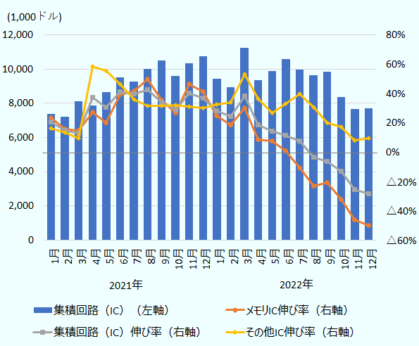 韓国税関が公表する貿易統計によれば、2022年の韓国の輸出は前年比6.1%増の6,837億ドルとなり、2021年の伸び率(25.7%増)から大きく減速した。月別の輸出の伸び率(前年同月比)でみると、2022年10月に5.8%減と、2020年10月以来、24カ月ぶりのマイナスに転じ、その後11~12月もマイナスで推移した。輸出構成比で16.5%を占める半導体の集積回路(以下、IC)(注1)の輸出が、8月から年後半にかけて大幅なマイナスに転じたことで、全体の伸びを下押しした形である(図参照)。
