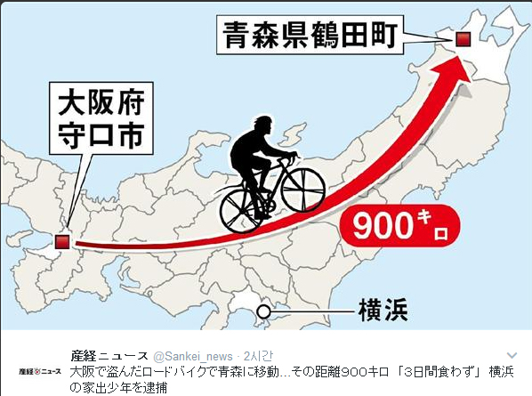 五所川原署によると、少年は昨年9月上旬ごろ、横浜市の自宅を家出し、家族が神奈川県警に行方不明届を出していた。少年は寒空の下、大阪で盗んだロードバイクで青森までの900キロ以上を約2カ月間、野宿などしながら走行したとみられ、同署は詳しい足取りや目的などを調べている。