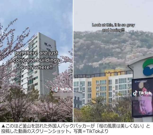 このカップルは釜山に到着した後の様子を撮った別の動画でも不満をはき出した。釜山市内の桜の風景が「美しくない」というのだ。カップルは釜山市西区のマンションや街を歩きながら、「私たちはステキな景色を期待していたが、ここはどこに行ってもコンクリートのビルでいっぱいだ」「くすんでいて、つまらない風景だった」と投稿した。