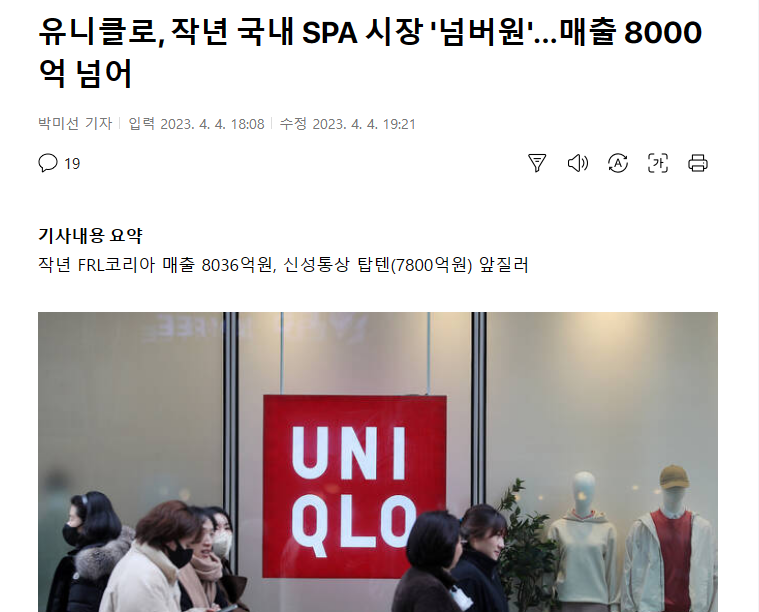 ユニクロの2021会計年度(2020年9月~2021年8月)の売り上げは5824億ウォンで、トップテンの2021年年間売り上げ5850億ウォンより低かった。当時、ノージャパン運動の余波で国内SPAブランド1位のタイトルをトップテンに奪われ、トップテンは異例の成果を上げて注目された。