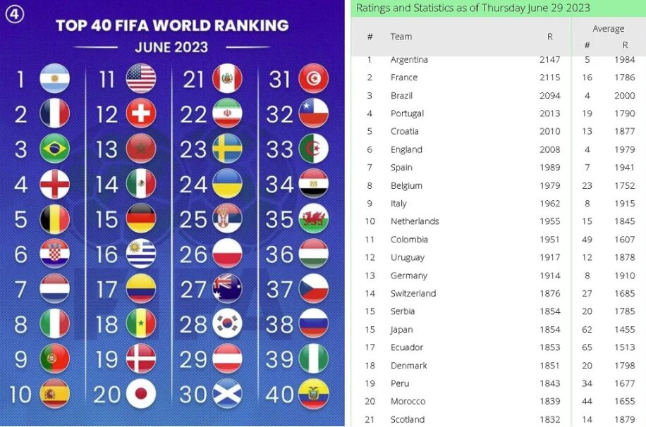 FIFAランキング1位はカタールW杯で優勝したアルゼンチンだった。昨年12月にはブラジルに次ぐ2位だったが、先月のAマッチデー期間中にパナマ(2-0勝)とキュラソー島(7-0勝)に勝利しし、ランキングポイントを上げて1位になった。アルゼンチンがFIFAランキング1位になったのは2017年3月以来6年ぶり。